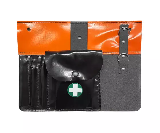 Metsurin työkaluvyöhön, tai tavalliseen vyöhön kiinnitettävä takakappale tarvikkeille. Taskusta löytyy paikka viilalle tai merkintäkynälle, ensiapupakkaukselle sekä pidike metsurinmitalle.