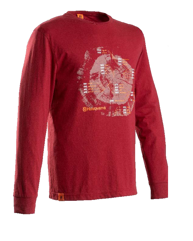 Uusi sesonkimalli. Puolukanpunainen pitkähihainen paita "Vuosirenkaat" -kuosilla. Vuosirenkaisiin on taltioitu legendaarisimpien Husqvarna sahamallien julkaisuvuodet. Materiaali: 70 % puuvillaa, 30 % polyesteriä
