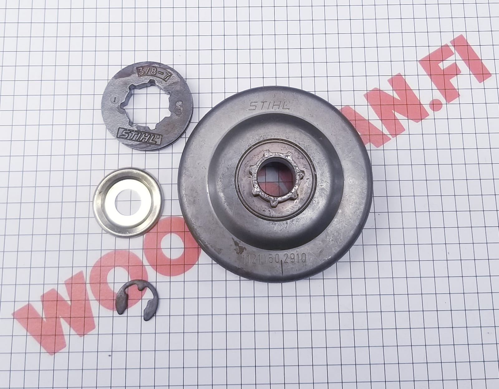 3/8" 7h. Vetopyöräsarja / kytkinrumpu STIHL moottorisahoihin 026, MS 260 ja MS 280. Irtorimmipyöräinen = kulunut rimmipyörä voidaan vaihtaa erikseen.